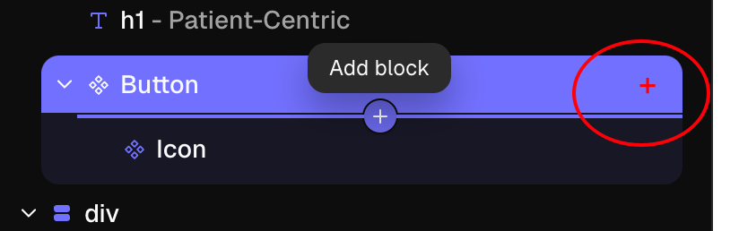 When adding an element or component inside a target element, I am using the add block functionality. But this is a bit inconvenient coz after that I’d have to drag the element inside the target element. It would be nice if there’s a plus button there (see pic) that will automatically add the selected block/element/component INSIDE the target element.